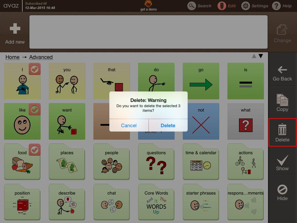 - Tap Delete to confirm the deletion. All the selected items will be deleted. If you have selected a folder, all the words and sub folders within that will be deleted.