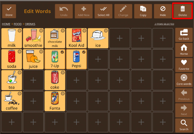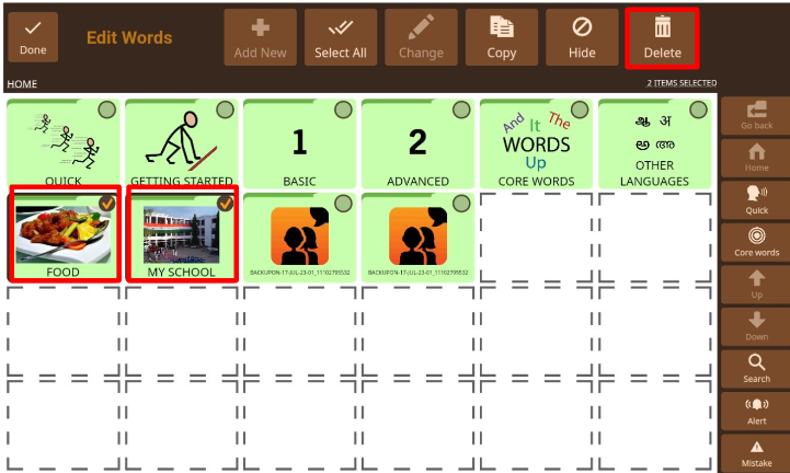 - Tap to select the words and/or folders that you wish to delete.