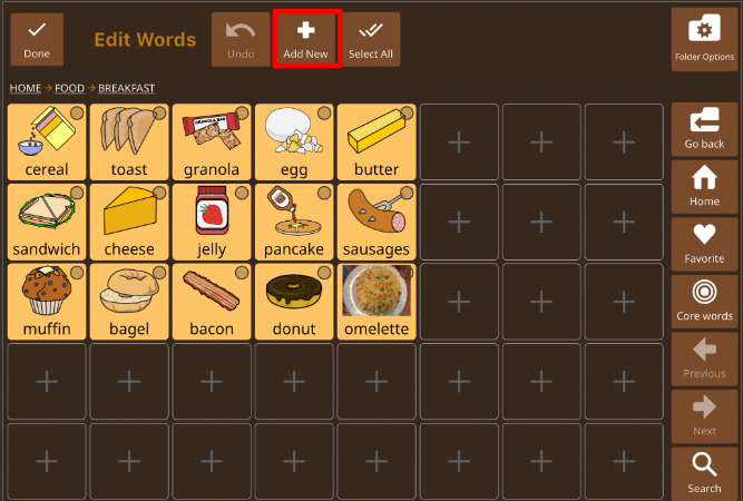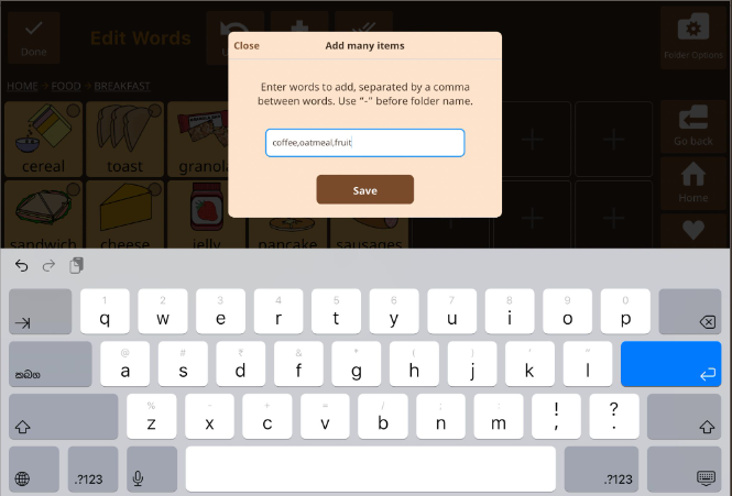 You can quickly add multiple words or folders at one go in Avaz. This is a huge time-saver, as it not only adds the words but also adds the images and color codes (background colors) automatically for all the words at one go.
