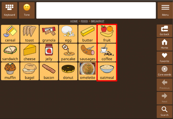 1. e.g. coffee, oatmeal, fruit and tap Save to add the words.