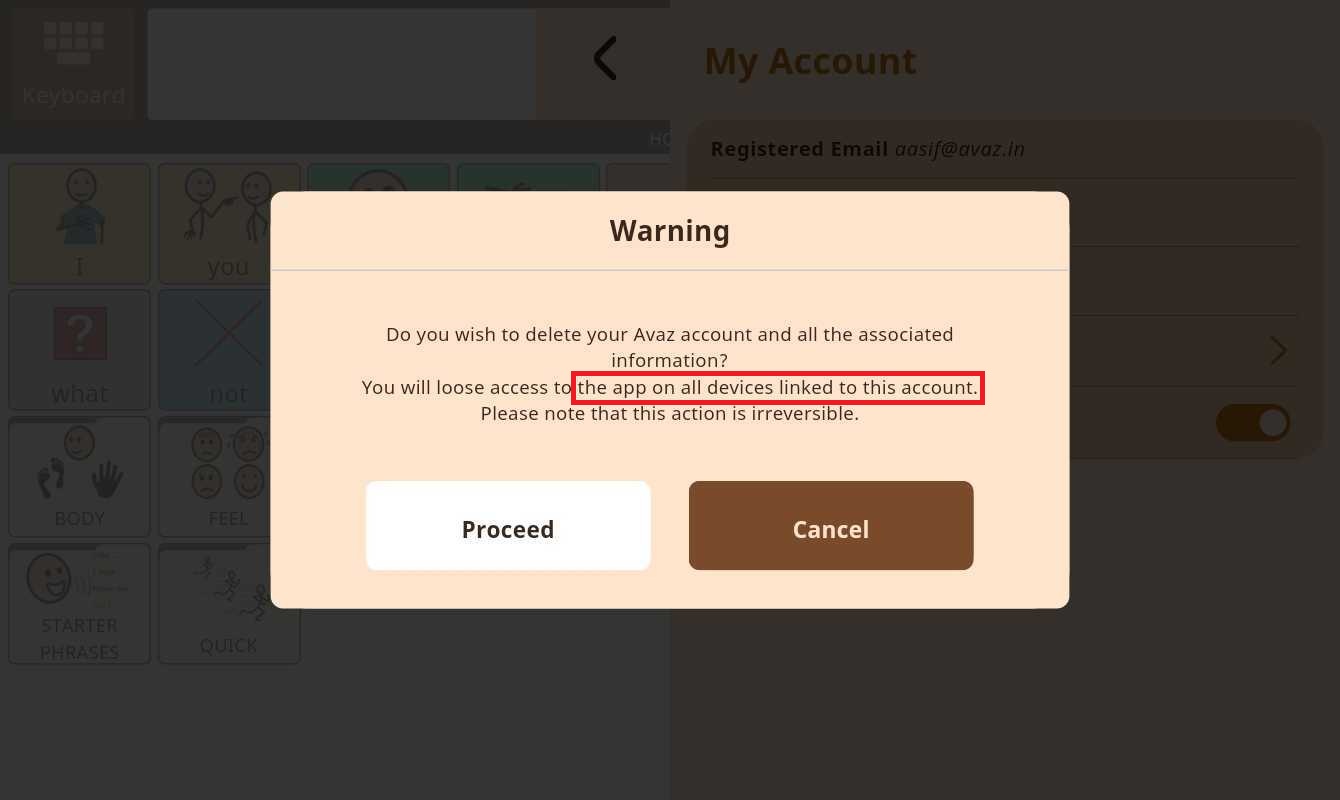 3. A window pops up for a confirmation of the Account deletion and all it's associated information. Please note that the action is irreversible. Once your account is deleted it cannot be restored.